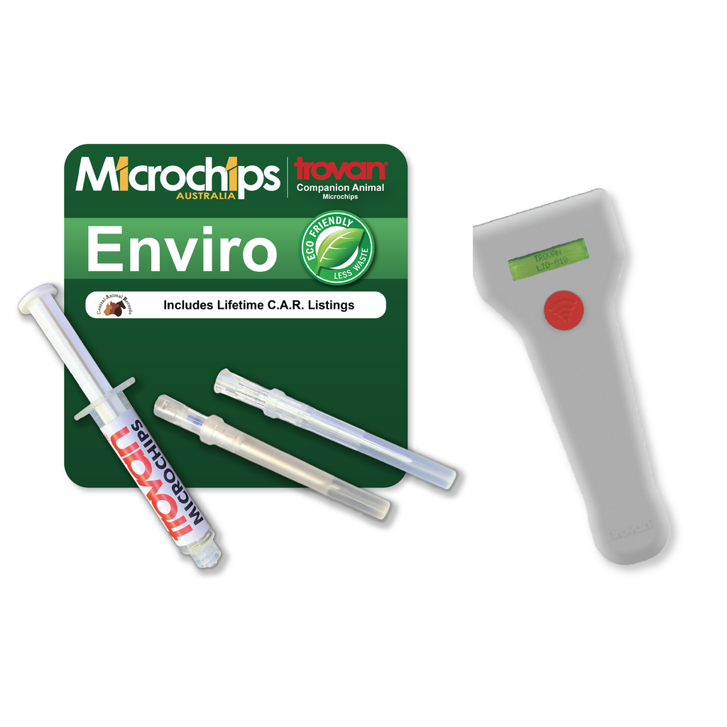 Enviro Format: This combines the needle and transponder only and requires the use of a re-usable implanter to implant the microchip. This format is designed for those who wish to reduce their impact on the environment by limiting the amount of plastic waste – only the needle is disposed of after use.